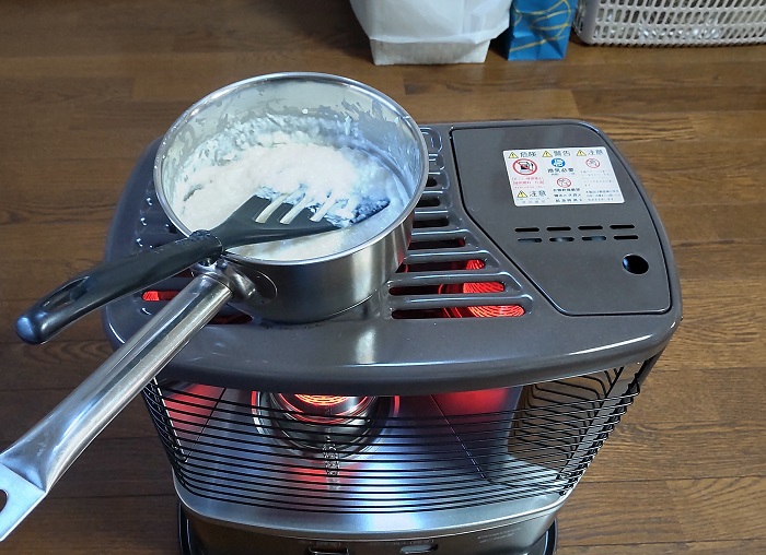 ⑥ここからは石油ストーブの上に手持ち鍋を移し